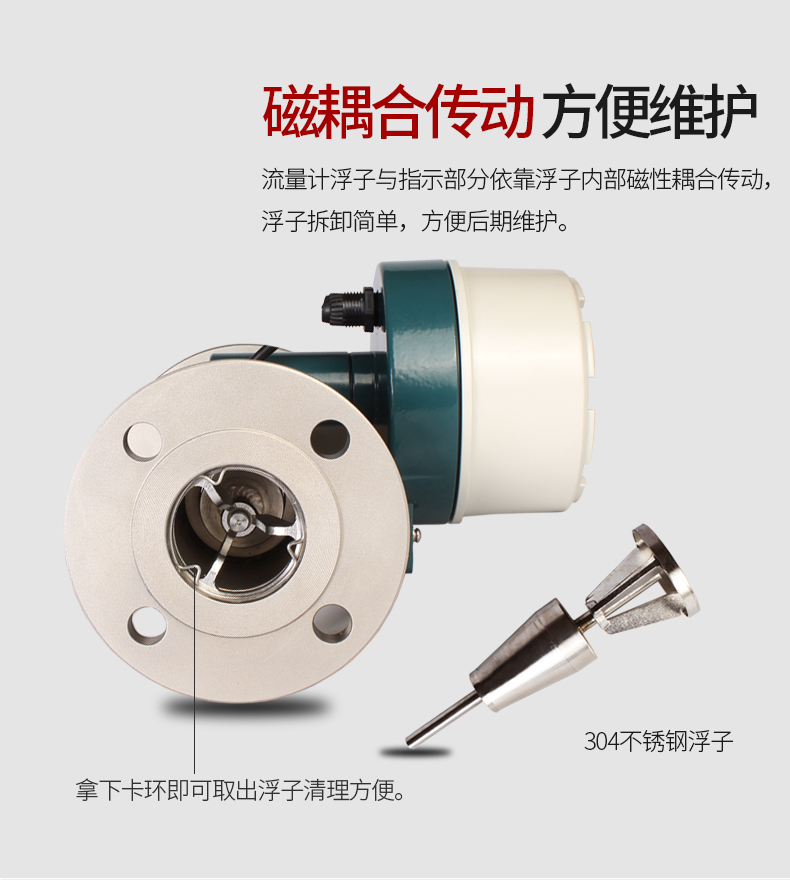 雙指示系統(tǒng):智能金屬管轉(zhuǎn)子流量計采用磁耦合原理,通過機械傳遞指示瞬時流量,同時帶動傳感磁鋼將對應流量信號的磁信號通過電子轉(zhuǎn)換成數(shù)字信號,通過液晶顯示瞬時流量及累積流量。這樣的好處是:一旦電子部分出現(xiàn)故障,獨立的機械指示系統(tǒng)仍然可以反映現(xiàn)場流量的大小,提高了儀表的可靠性。