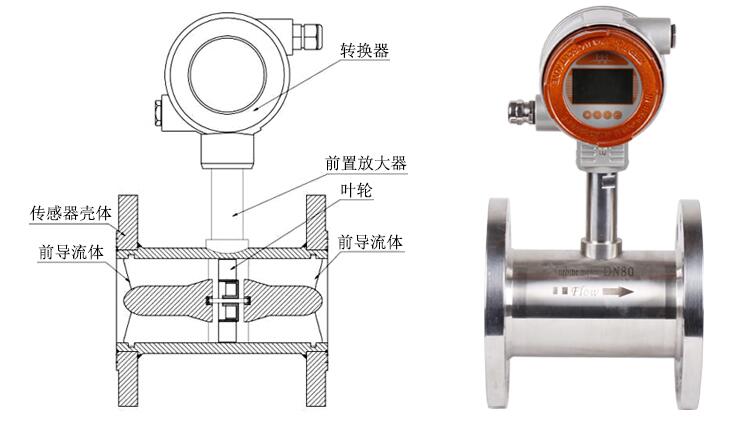 流體流經(jīng)傳感器殼體,由于葉輪的葉片與流向有一定的角度,流體的沖力使葉片具有轉(zhuǎn)動力矩,克服摩擦力矩和流體阻力之后葉片旋轉(zhuǎn),在力矩平衡后轉(zhuǎn)速穩(wěn)定,在一定的條件下,轉(zhuǎn)速與流速成正比,由于葉片有導(dǎo)磁性,它處于信號檢測器(由**磁鋼和線圈組成)的磁場中,旋轉(zhuǎn)的葉片切割磁力線,周期性的改變著線圈的磁通量,從而使線圈兩端感應(yīng)出電脈沖信號,此信號經(jīng)過放大器的放大整形,形成有一定幅度的連續(xù)的矩形脈沖波,可遠(yuǎn)傳至顯示儀表,顯示出流體的瞬時流量或總量。在一定的流量范圍內(nèi),脈沖頻率f與流經(jīng)傳感器的流體的瞬時流量Q成正比,流量方程為:
