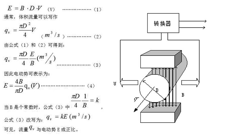 電磁流量計(jì)測(cè)量原理是基于法拉第電磁感應(yīng)定律。流量計(jì)的測(cè)量管是一內(nèi)襯絕緣材料的非導(dǎo)磁合金短管。兩只電極沿管徑方向穿通管壁固定在測(cè)量管上。其電極頭與襯里內(nèi)表面基本齊平。勵(lì)磁線圈由雙向方波脈沖勵(lì)磁時(shí),將在與測(cè)量管軸線垂直的方向上產(chǎn)生一磁通量密度為B的工作磁場(chǎng)。此時(shí),如果具有一定電導(dǎo)率的流體流經(jīng)測(cè)量管,將切割磁力線感應(yīng)出電動(dòng)勢(shì)E。電動(dòng)勢(shì)E正比于磁通量密度B、測(cè)量管內(nèi)徑d與平均流速V的乘積,電動(dòng)勢(shì)E(流量信號(hào))由電極檢出并通過(guò)電纜送至轉(zhuǎn)換器。轉(zhuǎn)換器將流量信號(hào)放大處理后,可顯示流體流量,并能輸出脈沖,摸擬電流等信號(hào),用于流量的控制和調(diào)節(jié)。