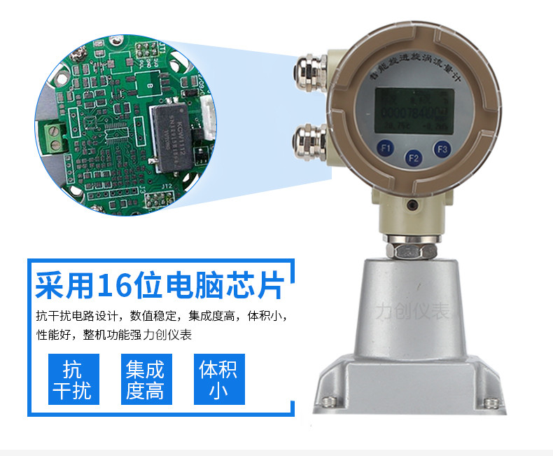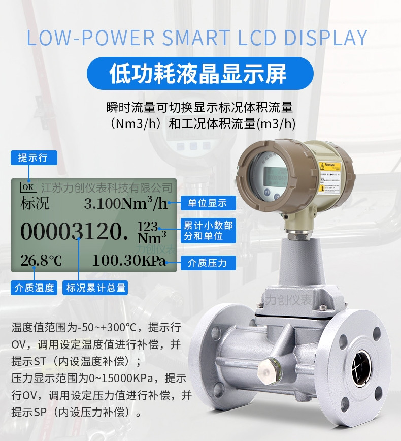 采用漢字點陣顯示屏,顯示位數(shù)多,讀數(shù)直觀方便,可直接顯示工作狀態(tài)下的體積流量、標準狀態(tài)下的體積流量、總量,以及介質(zhì)壓力、溫度等參數(shù);